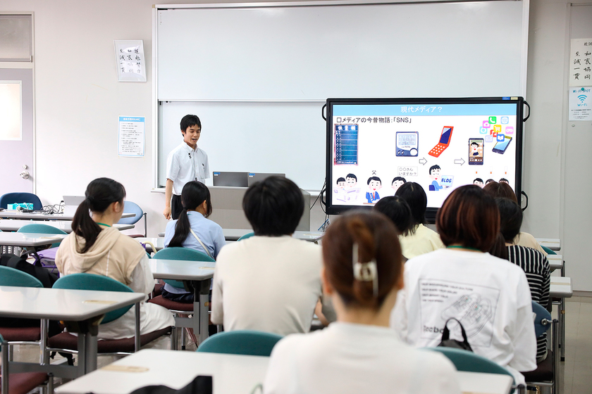 甲子園大学では1年次から少人数ゼミで学び、教員との距離が近く、個人面談などを通じて学生を支援しています。講義ではアニメなどを教材に日常の話題を交え、理解しやすい内容を心がけています。ゼミでは雑談から始めることで緊張を和らげ、発表や課題にはメリハリを持って取り組み、学生が目標に向かって前向きに学べる環境づくりを重視しています。