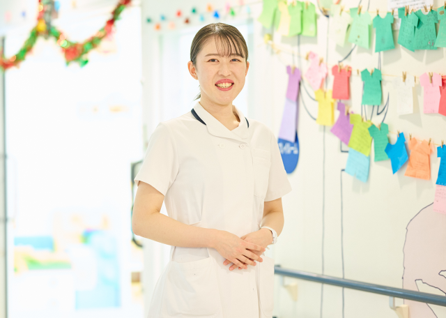 希望していた小児科病棟で働いています。日々の看護はもちろん、保育士さんに子どもの様子を聞いたり、理学療法士さんに病棟でもできるリハビリを指導してもらうなど、多職種とも連携しながらケアを行っています。子どもたちが安全に過ごせる療養環境を整えることも大切な仕事。当院では「遊び・勉強」といった子どもの権利を大切にしていて、プレイルームに加え自然とふれ合えるキッズガーデンがあることも気に入っています。病棟では主な小児疾患に関する勉強会や急変対応のトレーニングも定期的に行っていて、知識やスキルを磨いています。私は小児科病棟所属ですが、救急外来の応援で成人の患者さんを看る機会もあります。小児以外にも幅広い看護経験を積めることが、この病院を選んだ理由のひとつです。
