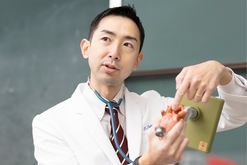 授業は、飯田教授が日頃診療で診ている患者さんの治療の様子や検査画像、訓練方法などをわかりやすく編集した動画を教材として使用。実習は臨床で必要な機材や高齢者モデルのシミュレーターを使って実践的に行われています。「特にリハビリなどは動きがメインになるので、静止画よりも動画を観察することが重要になります。食べる機能が落ちた患者さんを想定した設定で、相互で検査や訓練をしてもらいます」とのこと。また2024年度は、歯学部5年生全員を対象に嚥下内視鏡検査という精密検査の体験が実施されました。