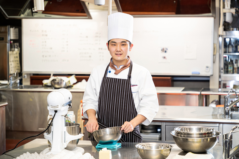 調理師科の1年で調理師免許を取得しました。製菓科で学んでいる今は「調理の方が向いている」と感じています。実は僕の手は温かくて、クリームを絞る時に体温で溶けるなど温度管理が大変なんです。不利なく楽しめるのは料理かな、と思いました。最終目標は自分の店を出すことですが、今はなによりも技術アップが優先です。