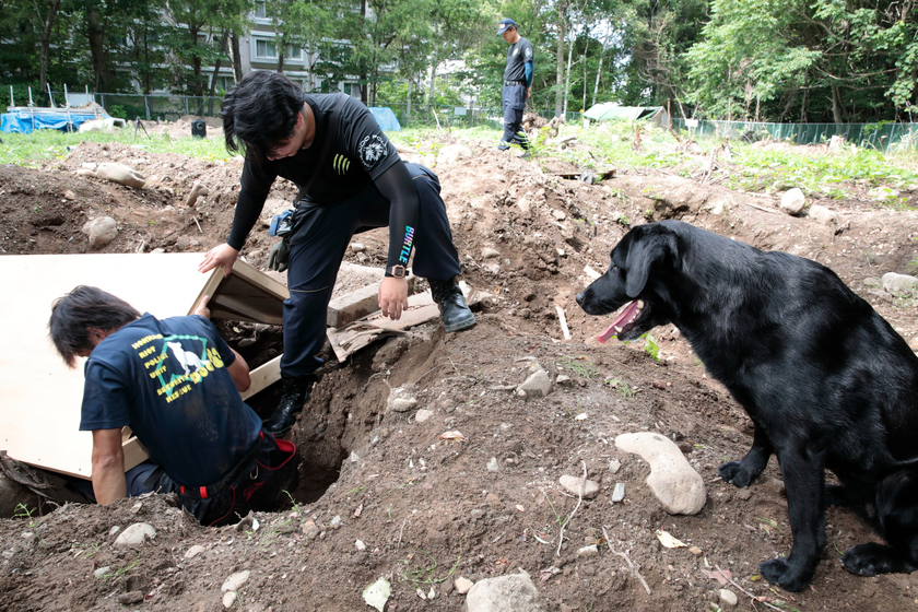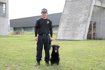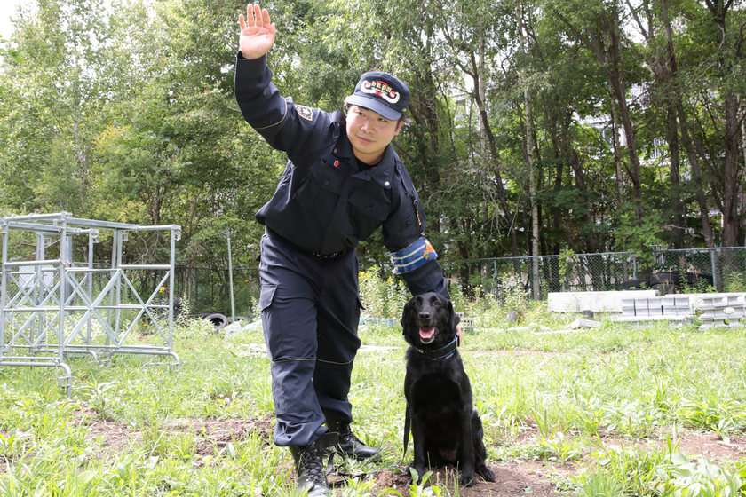 災害救助犬のキャン(ラブラドールレトリバー)とコンビを組んで現場に行き、要救助者や遭難者を発見し、助ける任務に携わっています。災害や救助要請は事前の予測ができないため、すぐに対応できるよう、普段から犬の訓練や犬の体調・コンディション管理を行うことも、私たち「警察犬ハンドラー」には欠かせない仕事です。また、この仕事は人間だけではできません。担当犬のキャンがいてこその仕事で、「人と犬との協業」があって初めて「何ものにも代えがたい人命」を救うことができるのです。キャンは私にとって、まさに一心同体のバディ。大変な仕事ですが、キャンとともに仕事を成し遂げたときのやりがいは、言葉にできないほど大きいです。