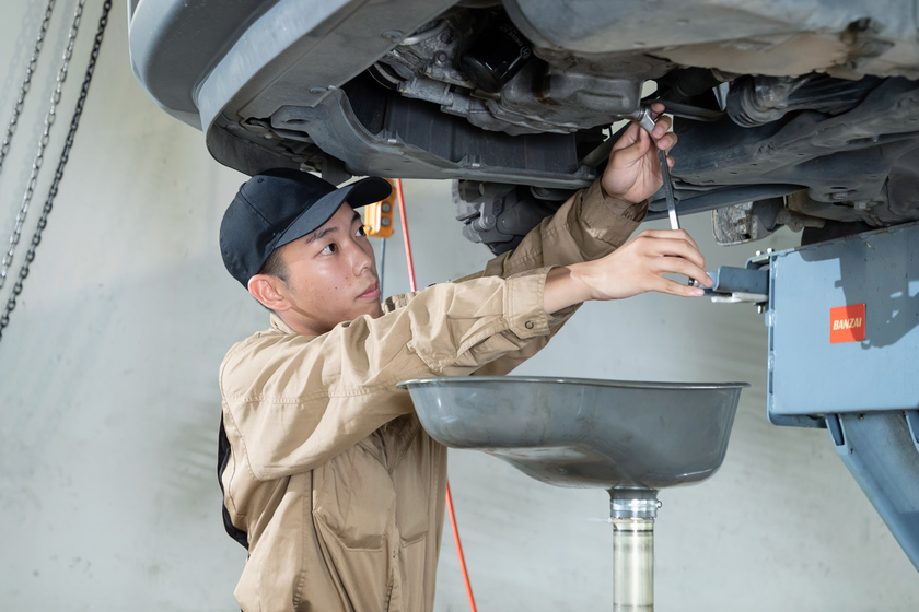 実習室でたくさんの実技を行い整備士をめざします。これはエンジンオイル交換の様子