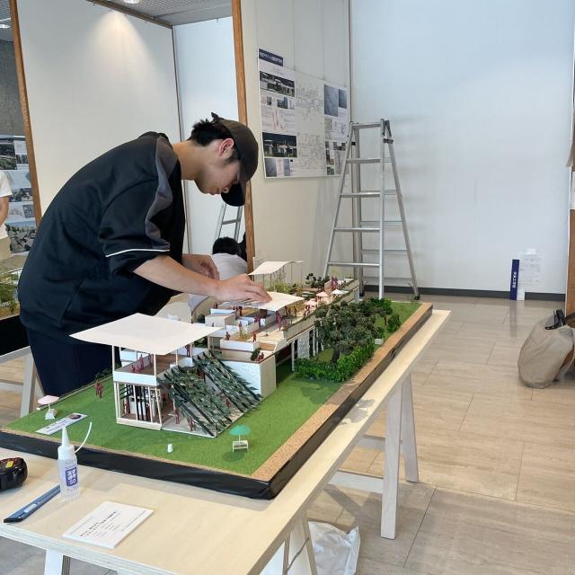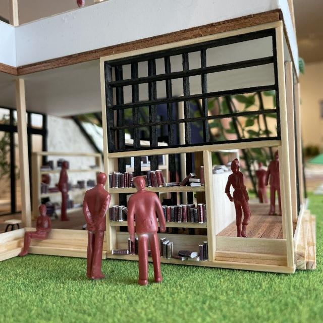 時間を費やしました。設計段階から「こんな空間にしたい。」「こんなスペースがあったら楽しい。」という考えを先行させてパースを描き、区切って造った空間を繋げました。人の流れが目に見えるように。目で楽しめるように。人を配置し、ボード、模型において色を統一しました。日常からはかけ離れた、それでいてどこか落ち着きを感じる。誰もが使える。誰の身近にもある。そんな空間を目指した作品になったと思います。