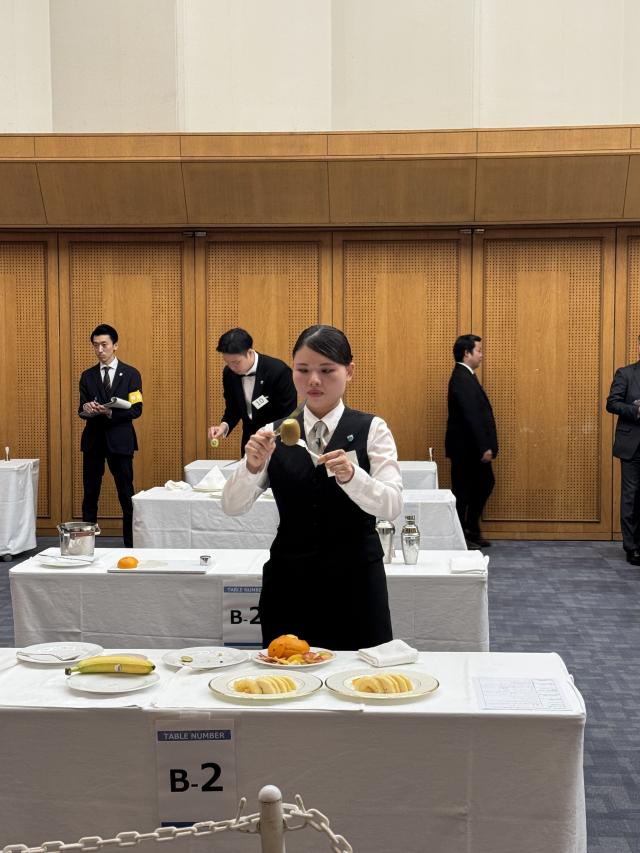 競技は、サービス技術を中心に「テーブルセッティング」「オードブル(カクテルシュリンプ)作成提供」「メイン料理(ローストチキン)の取り分け&提供」「ワイン&食後酒サービス」「カクテル作成」「フルーツカービング&クレープシュゼットの作成」「ワインのブラインドテイスティング」「英会話によるプレゼン」など多岐にわたり、