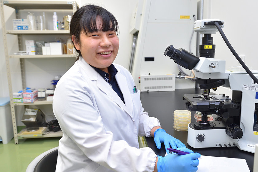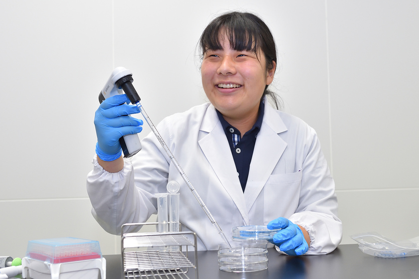 アース環境サービス(株)彩都総合研究所 勤務/健康化学分析学科/2020年卒業/総合環境衛生管理事業という専門性の高いサービスを展開する企業の分析センターに勤務する山中さんは、西日本ラボのチーフ。「遺伝子、異物、微生物の3つの検査部門のなかで、私は入社以来ずっと微生物部門に所属しています。暑い季節は食中毒などの問題も発生しがちなので、処理数も増えてかなり忙しいです。チームのみんなと協力して、終業時間までにすべての作業を終わらせることを目標に頑張っています」。そんな彼女の趣味は、旅行や食べ歩き。研修では地方への出張の機会もあり、仕事終わりに出張先の名産や美味しいものに出会うのが楽しみだそう。