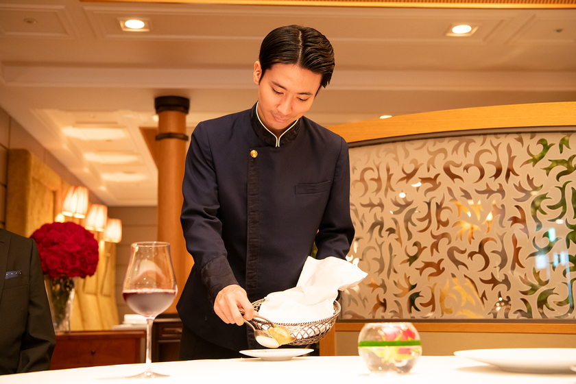 帝国ホテルのファインダイニングである「レ セゾン」で、お客様に料理を運んだり、パンのサービス、キャプテンのサポートなどを行っています。お客様の表情や会話、料理を召し上がるスピードなどから、お客様のご要望を先読みし、専門学校時代に習得したサービス技術を活かして、心地よい空間をご提供できるよう努めています。実際にお客様からお褒めの言葉をいただいたり、感動していただいた時は充実感に満たされます。また、当レストランは、接待や会食、誕生日や結婚記念日など、お客様の特別な機会にご利用いただくことが多いです。先日もサプライズのお手伝いをし、お客様の喜んでいる姿を見て「働いていてよかった」と心から感じました。