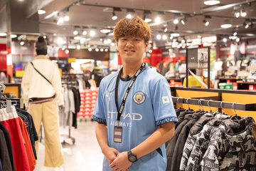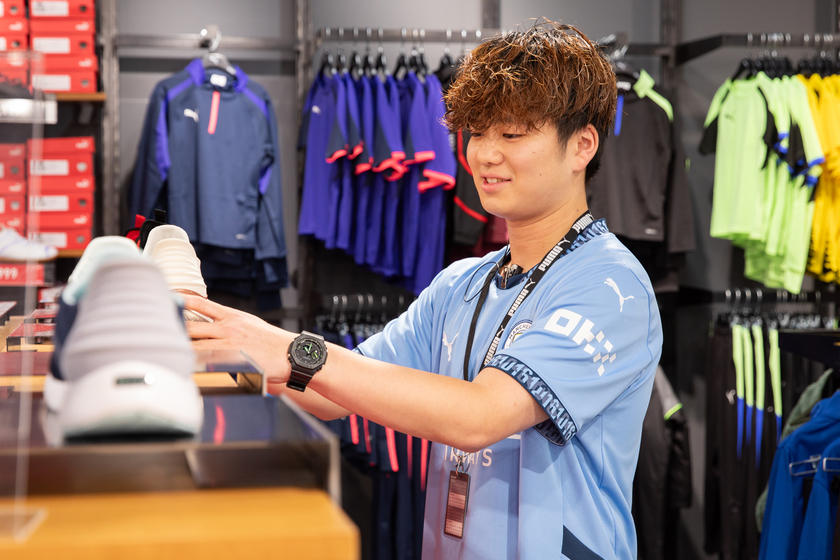 プーマジャパン株式会社/スポーツ用品メンテナンス科/2024年卒/中学時代からサッカーに打ち込んできた松山さん。憧れのブランドで働くという夢を、アップルスポーツカレッジでの専門的な学びを通じて実現させました。現在は軽井沢の直営ショップで、商品販売から店舗運営、スタッフ育成、数値管理まで幅広い業務を担当。働きやすい環境づくりには良好な人間関係が欠かせないという信念のもと、日々多くの人と積極的に対話を重ね、より良い店舗づくりに取り組んでいます。