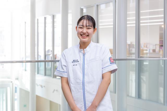 自分の周囲の人たちが健康で長生きできるようサポートしたいと思い、この分野を選びました。藍野大学を通んだのはオープンキャンパスで学校や先生の雰囲気を見て、ここなら4年間頑張れそうだと感じたからです。