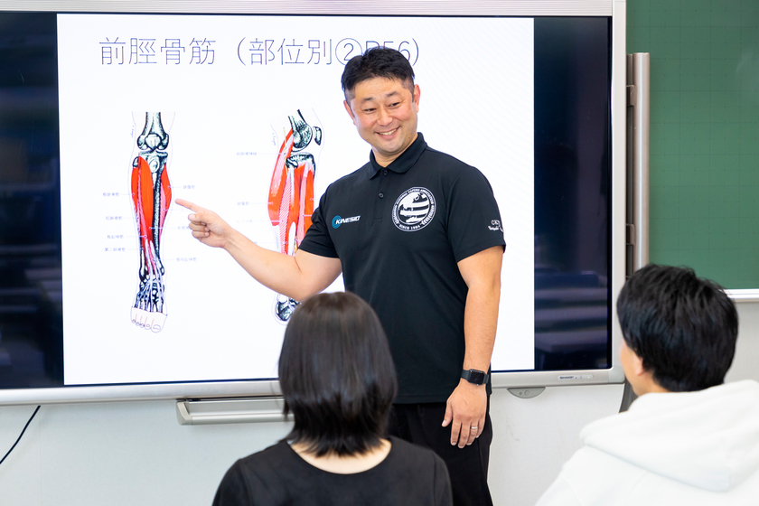 理学療法(リハビリテーション)の一つである運動療法では、ウォーキングや筋力トレーニング等の運動によって、症状の改善や予防を図ります。その中で私が専門としているのは、筋力強化の運動療法。運動器、脳血管、心大血管、呼吸器のすべてのリハビリで使用できる手技であり、科学的根拠にも基づいています。そこに運動の機能をサポートする「テーピング」や、心肺機能を強化する「心臓リハビリ」を組み合わせることにより、レベルの高いリハビリを行えると考えています。こうした運動療法の知識・技術は、高齢化や病気、怪我による運動能力低下を予防するだけではなく、スポーツ分野でのパフォーマンス向上にもつながります。授業でこれらの知識・技術を提供することで、幅広いフィールドで活躍できる理学療法士を目指して欲しいと願っています。