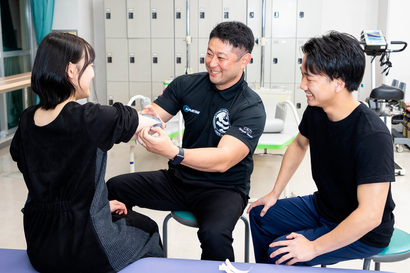 高橋先生が担当する運動療法の授業では、筋肉に抵抗(レジスタンス)をかける動作を繰り返し行う「レジスタンストレーニング」の知識・技術に加え、トレーニングを高める栄養や、姿勢の分析・考察など幅広い内容を扱います。「実技の時間を多くとることで、バランスよく頭と体で学べるようにしています」と高橋先生。テーピングの授業では、ペアを組んで互いにテープを貼りあった後、効果を話し合います。高橋先生が専門のキネシオテーピングの貼り方は100種以上。テープの扱いに慣れてもらうために練習の時間を多くとっています。