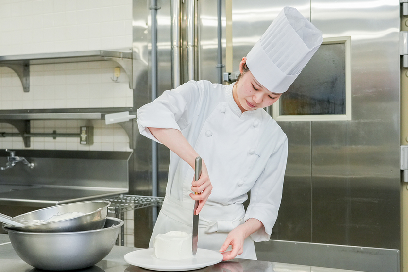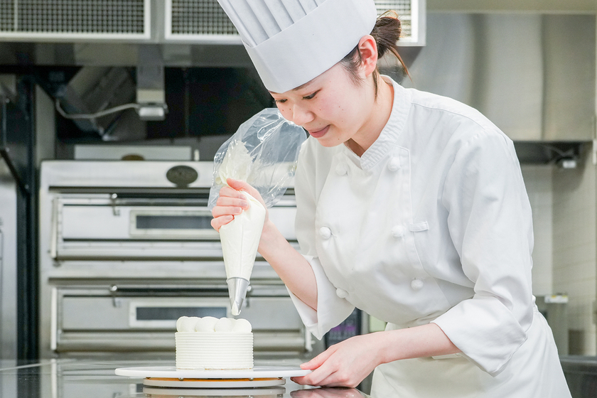 ザ・キャピトルホテル 東急 ペストリー 勤務/製菓総合本科 卒/2024年卒/高校入学後、思い悩んだ末にパティシエになろうと決めたMさんだが、学校選びに関して直感を優先させ、“この雰囲気は自分に合う!”と確信したYAMANOTEに入学。実家からでは通学に2時間以上かかるため都内での一人暮らしを選択し、ファストフード店や銭湯(番台や清掃)でアルバイトをしながら学習。パティシエに求められる技術を身につける「毎日実習」はもちろんだが、「デザイン」「ドリンク」などの授業も興味深く学ぶことができたと言う。卒業後は“ケーキだけでなくコース料理のデザートもつくれるホテルパティシエになりたい”という希望を叶え、昨年より現職。