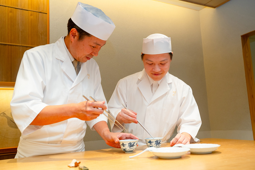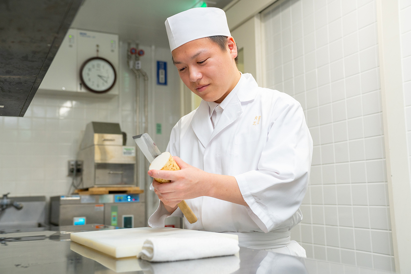 在学中は学内レストランなどでお客様に料理を提供する「すし研究部」に所属していました。調理の様子をお客様に見られるため、きれいな所作も意識するようになり、仲間たちがスムーズに動ける動線や、それぞれの料理に適した温度帯で素早く提供する大切さなど、多くのことを学ぶことができました。また、毎日行われる実習では野菜の切り方、魚の捌き方から飾り切りまでを丁寧に教えていただいたおかげで調理師としての土台ができたと感じています。授業後は自主的な練習にも取り組み、特に桂剥きは1日に1本の大根を使ったほどです。努力の甲斐あって、入社後に先輩から「桂剥きだけはうまいな」と言われ、嬉しくなってしまいました(笑)。