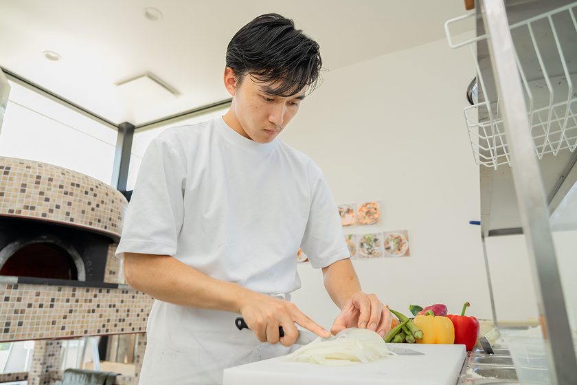 グループ直営9店舗目となる、淡路島に完成した新店舗を責任者として任されています。敷地内にオリーブ農園やグランピング施設がある自然豊かな場所で、薪窯で焼くピッツァがメインです。400度にもなる薪窯に生地を入れ、焼きあがりまでは1分ほど。生地を均等に手で伸ばす、窯の温度調整をするなど、技術も必要です。朝は薪窯に火を入れるところから始まり、掃除や仕込み、調理、接客、片付けなど、あらゆる業務を一人で行います。淡路島産の素材にこだわり、野菜は農園の畑、魚介は近隣の漁港で直接仕入れ。生産者さんとコミュニケーションを取るのは、貴重な体験です。経営面も試行錯誤しながら、良い店にしたいと日々格闘しています。